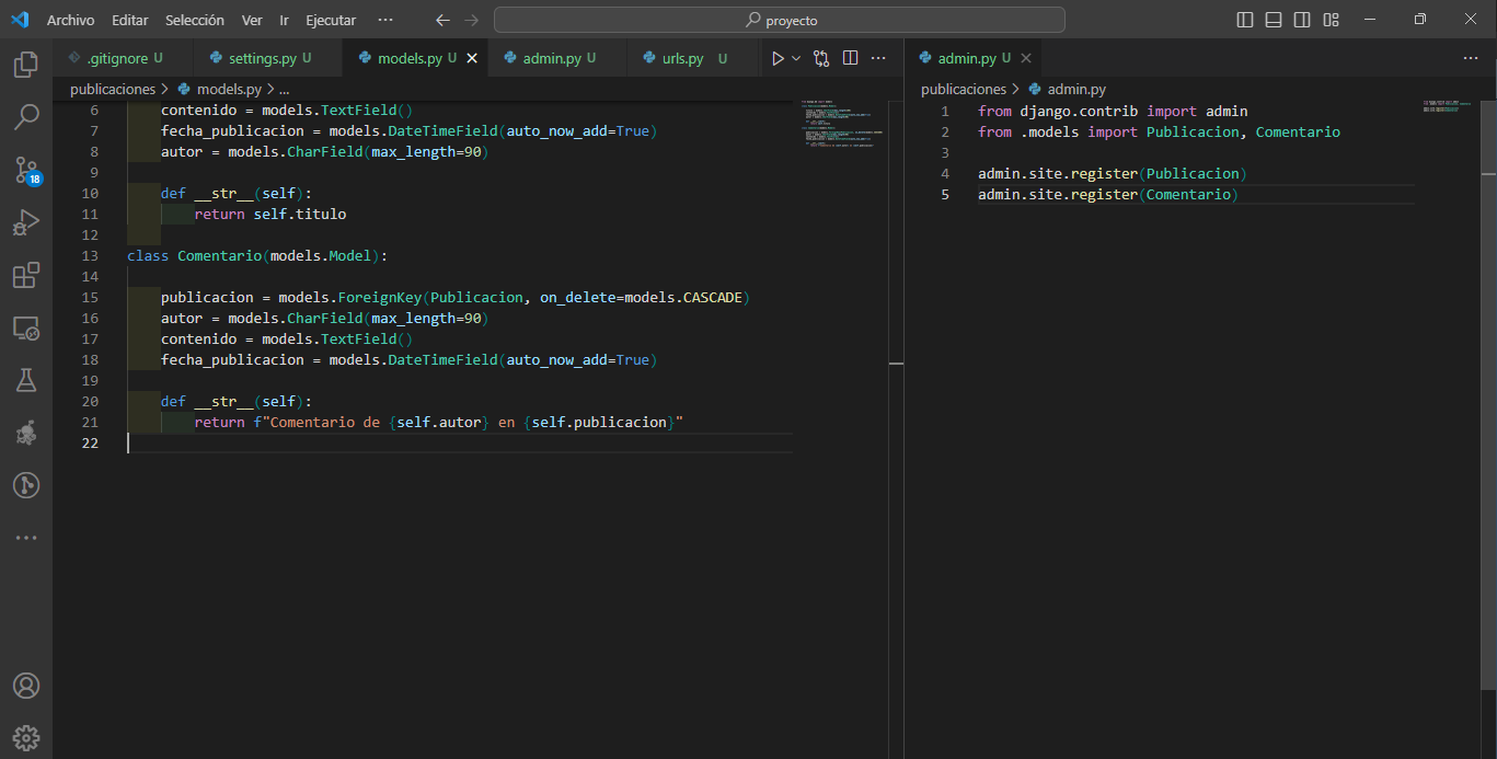 Ejemplo de las clases Publicación y Comentario en Django: