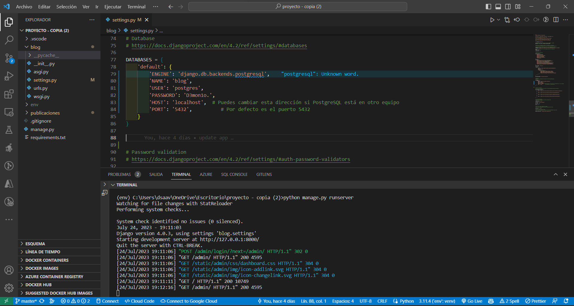pip install psycopg2Configurar Django para usar PostgreSQL: