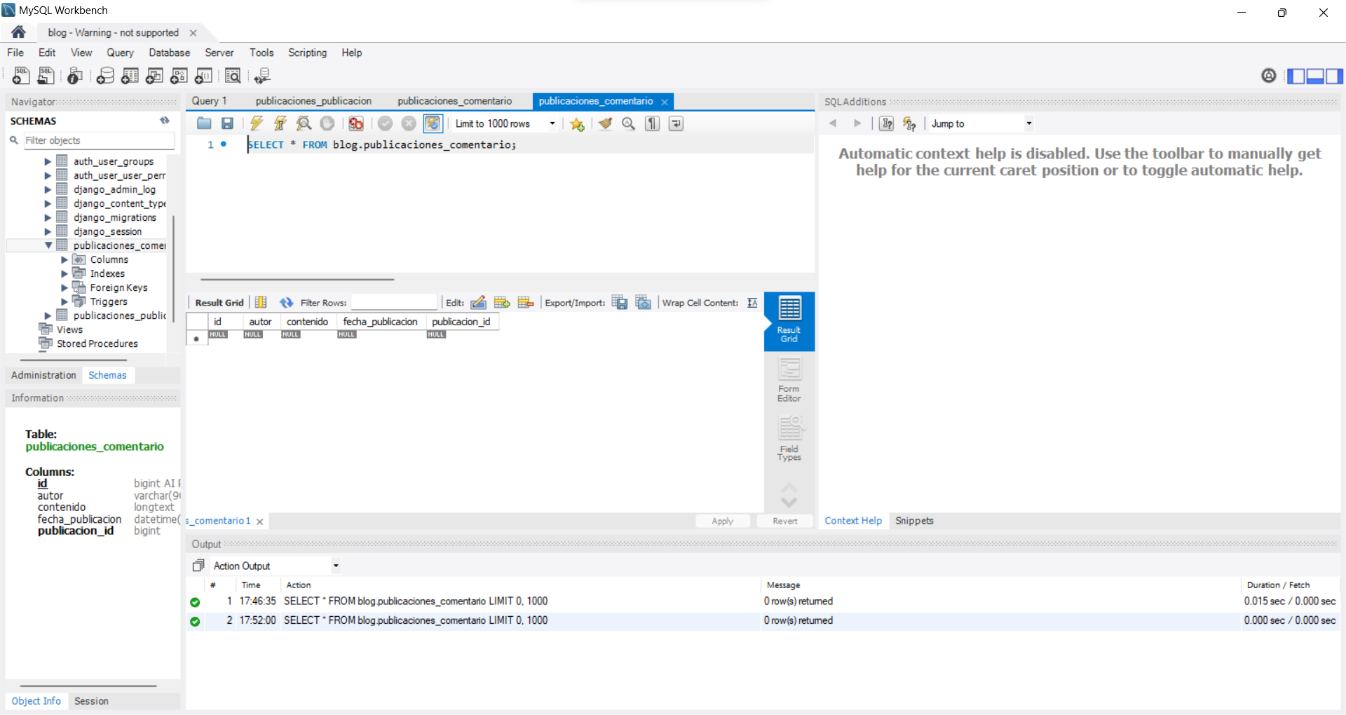 python manage.py migrateCon estos pasos, hemos diseñado nuestro modelo de Publicaciones en Django y aplicado las migraciones para crear la tabla correspondiente en la base de datos. Ahora estamos listos para utilizar nuestro modelo y almacenar datos en la base de datos.