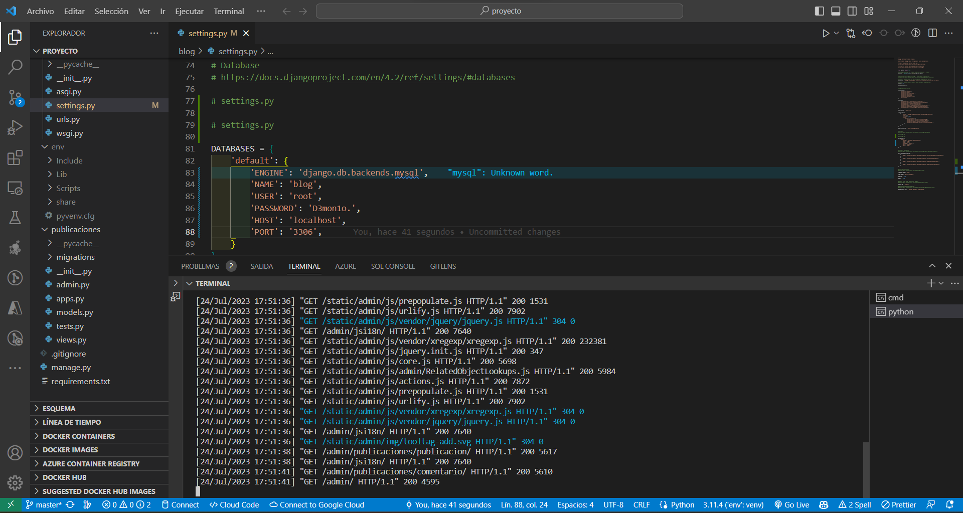 Modifica el archivo settings.py de tu proyecto Django y ajusta la configuración de la base de datos: